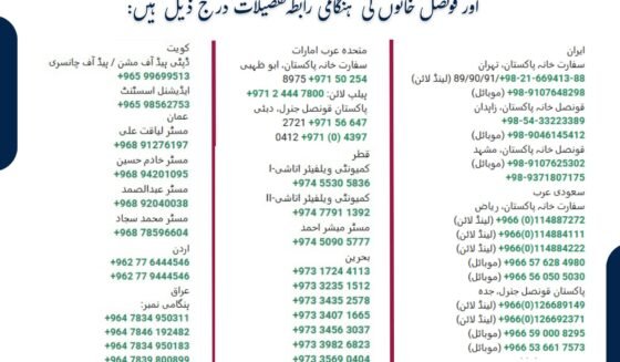 بیرونِ ملک مقیم پاکستانی شہریوں کی سہولت کے لیے سفارت خانوں اور قونصل خانوں کی ہنگامی رابطہ تفصیلات درج ذیل ہیں:
